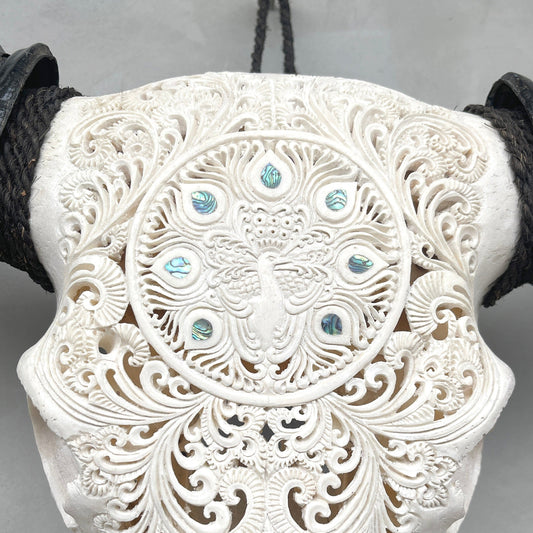 Pfau und Abalonen | Handgeschnitzter Büffelschädel