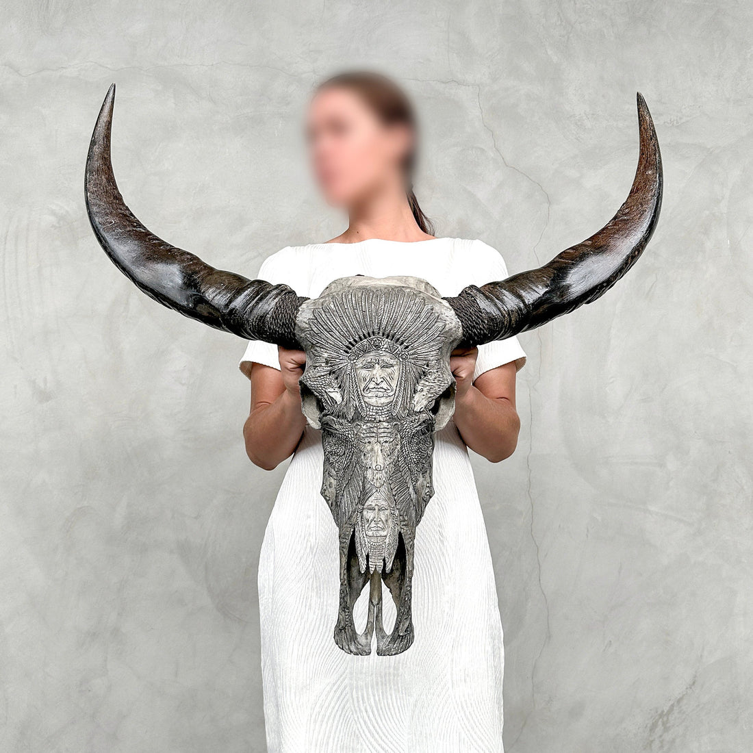 Erleben Sie die Schönheit und Tradition der Kunst der Ureinwohner Amerikas mit diesem handgeschnitzten Wasserbüffelschädel, der ein Design der Ureinwohner Amerikas zeigt. Die detaillierte Schnitzerei spiegelt die tiefe spirituelle Verbundenheit der Stämme mit der natürlichen Welt wider. Sie ist auch eine Hommage an den spirituellen Glauben und das kulturelle Erbe der Ureinwohner Nordamerikas. Verleihen Sie Ihrem Raum mit diesem beeindruckenden Meisterwerk einen Hauch von kulturellem Reichtum.