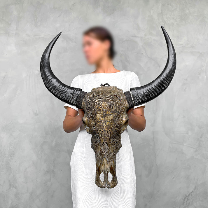 Erleben Sie die Mystik dieses meisterhaft handgeschnitzten Wasserbüffel-Schädels mit einem wunderschönen Ganesha-Motiv. Die exquisite Detailarbeit fängt die Essenz von Ganeshas Weisheit und Wohlstand ein und macht es zu einem Symbol für Positivität und Glück. Die Handwerkskunst dieses Meisterwerks ist äußerst beeindruckend und macht es zu einer wertvollen Ergänzung Ihrer Sammlung. Ob als Mittelpunkt oder Einzelstück, dieses Kunstwerk wird Ihrem Raum sicherlich einen Hauch kultureller Eleganz verleihen und gleichzeitig den Segen der Weisheit und des Erfolgs in Ihr Heim bringen.