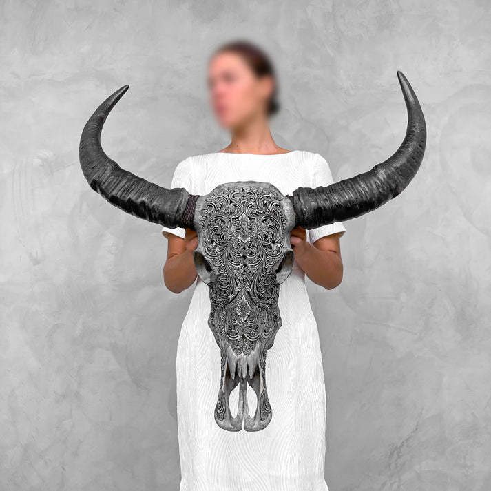 Holen Sie ein Gefühl von Ruhe und Schönheit in Ihr Zuhause mit diesem handgeschnitzten Wasserbüffelschädel, der mit filigranen Lotusmustern verziert ist. Diese detailreichen Schnitzereien schaffen ein faszinierendes Muster und eine atemberaubende visuelle Darstellung, die das handwerkliche Können des Künstlers zur Geltung bringt. Dieses Stück verleiht Ihrem Raum nicht nur einen Hauch von Schönheit, sondern dient auch als Symbol für Reinheit und Erleuchtung und lädt Sie ein, langsamer zu werden und die Schönheit um Sie herum zu schätzen.