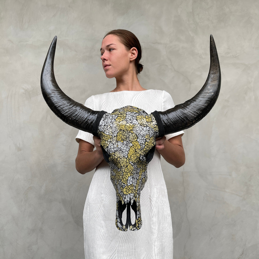 Lassen Sie sich von der fesselnden Schönheit dieses Wasserbüffelschädels verzaubern, der kunstvoll mit einem Glasmosaik in harmonischen Marmortönen verziert ist. Jedes fein gesetzte Glasstück formt ein zauberhaftes Mosaikmotiv, das zeitlose Eleganz und natürlichen Charme ausstrahlt. Auf diesem beruhigenden Hintergrund stechen die tief schwarzen Hörner in markantem Kontrast hervor, was ihm eine kühne Raffinesse verleiht. Ideal für Räume, die eine Fusion aus künstlerischer Finesse und moderner Raffinesse suchen, verspricht dieses Stück, Ihre Einrichtung durch seinen einzigartigen Charme und dezenten Luxus zu bereichern.