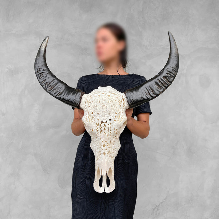 Entdecken Sie die beruhigende Schönheit unseres handgeschnitzten Wasserbüffelschädels, kunstvoll verziert mit einem faszinierenden Blumen-Mandala-Motiv. Jedes Detail dieses Meisterwerks, gefertigt von einem talentierten balinesischen Kunsthandwerker, erzählt eine Geschichte von Ruhe und Eleganz, die zum Innehalten und Nachdenken über seine Schönheit und Geheimnisse einlädt. Verleihen Sie Ihrem Raum einen Hauch von exotischem Charme mit diesem beeindruckenden Stück, einem Symbol für Harmonie und Erleuchtung, das sicherlich Bewunderung und Gesprächsstoff wecken wird.
